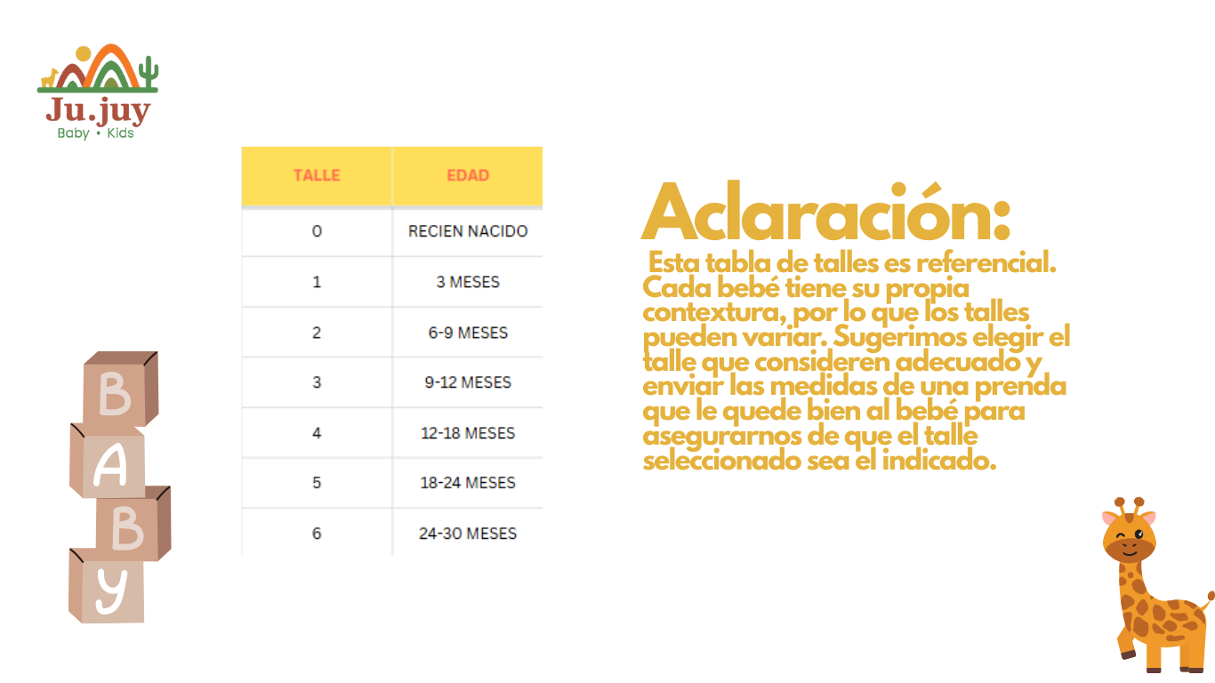 📌 Esta tabla corresponde a la línea de bebés y debe tomarse únicamente como referencia, ya que los talles pueden variar según la contextura de cada uno. Por eso ofrecemos la opción de que nos envíen las medidas de una prenda que les quede bien al bebé, como detalle al pie de la foto, para corroborar el talle correcto.